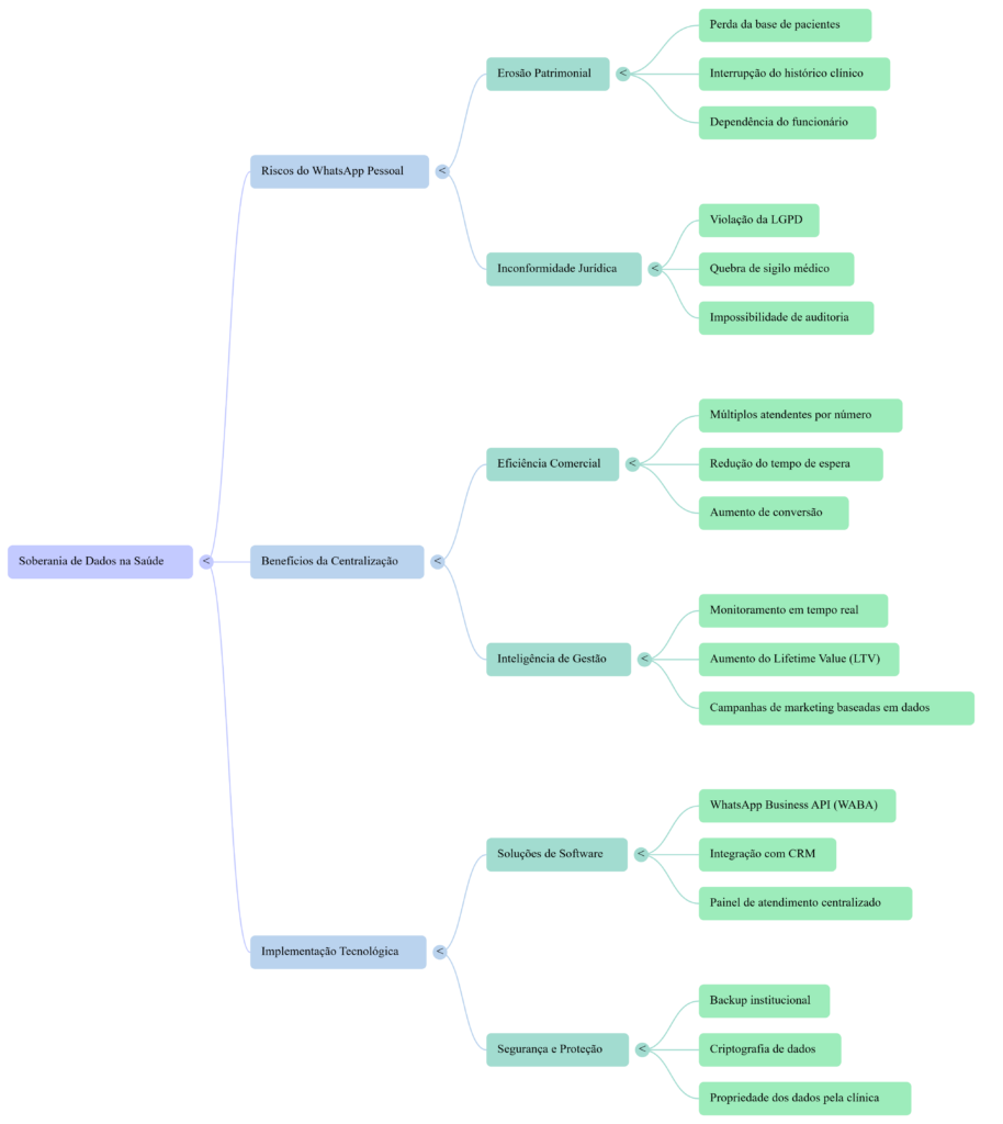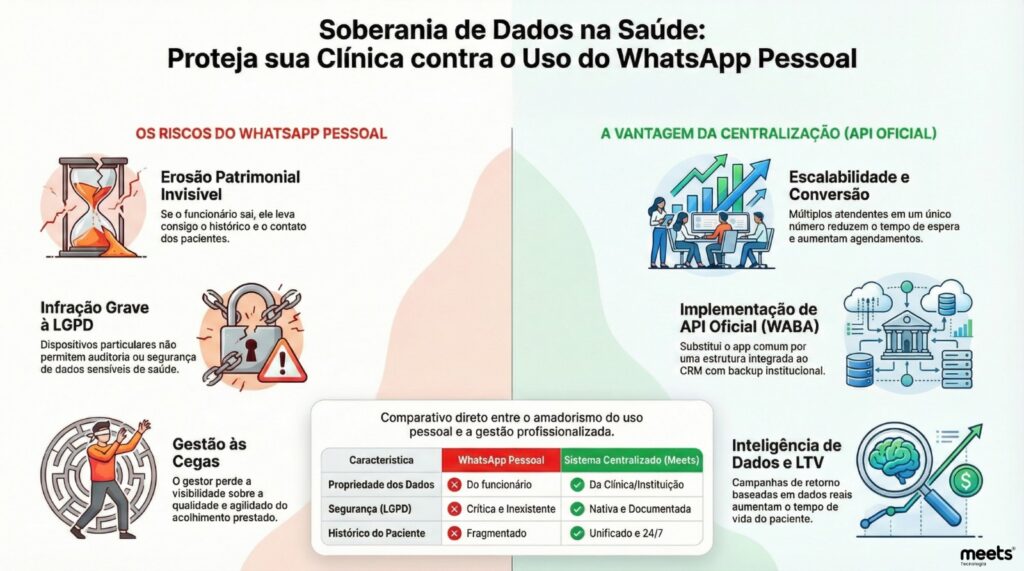 Essa é a realidade perigosa de clínicas e consultórios que ainda dependem do WhatsApp pessoal dos funcionários para agendamentos. Quando o atendimento não é centralizado, a soberania dos dados — ou seja, a posse real das informações dos seus pacientes — deixa de ser da empresa e passa a ser do indivíduo. Além do risco óbvio de perder o histórico de conversas e vendas, essa prática é uma “bomba-relógio” jurídica que fere diretamente a LGPD (Lei Geral de Proteção de Dados).